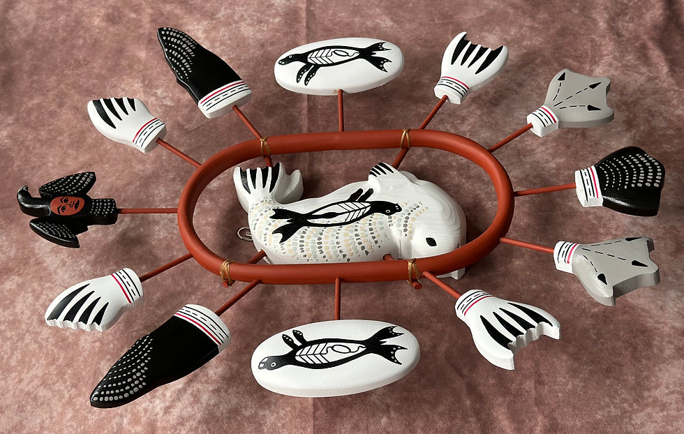 These masks were made from driftwood found near the shores around our island, primarily white spruce. They were carved and shaped using hand made chisels. The paints used were derived from white clay, and red ochre rock mixed with seal blood. The seal blood signifies the ancestral heritage of connecting to the sea-life of the mammal they hunted and what the species provided for them. Reindeer and walrus sinew were used as string.